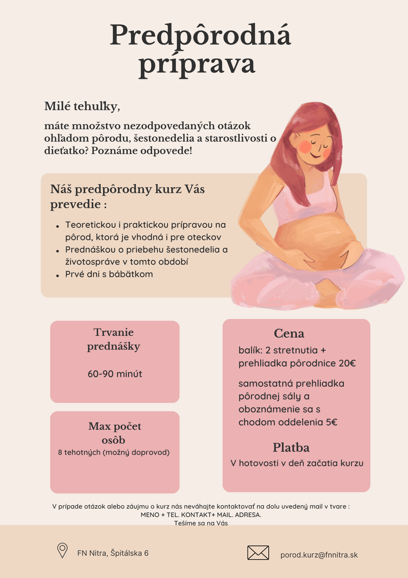Tehotným ženám poskytujeme sledovanie v ambulancii rizikovej gravidity, vedenie prehliadok pri odovzdaní do starostlivosti obvodným gynekológom, konzultáciu pôrodného plánu, predpôrodné kurzy a ďalšie služby. Neoddeliteľnou súčasťou sú vysokošpecializované služby v rámci perinatálnej medicíny, prenatálnej genetickej diagnostiky v spolupráci s ďalšími pracoviskami FN Nitra.